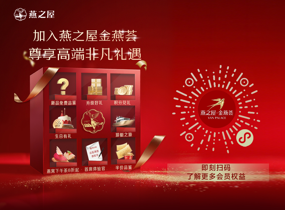 即刻掃碼,加入燕之屋金燕薈,開啟高端品質生活,為您定制更多專寵禮遇,享受專屬的尊貴體驗。